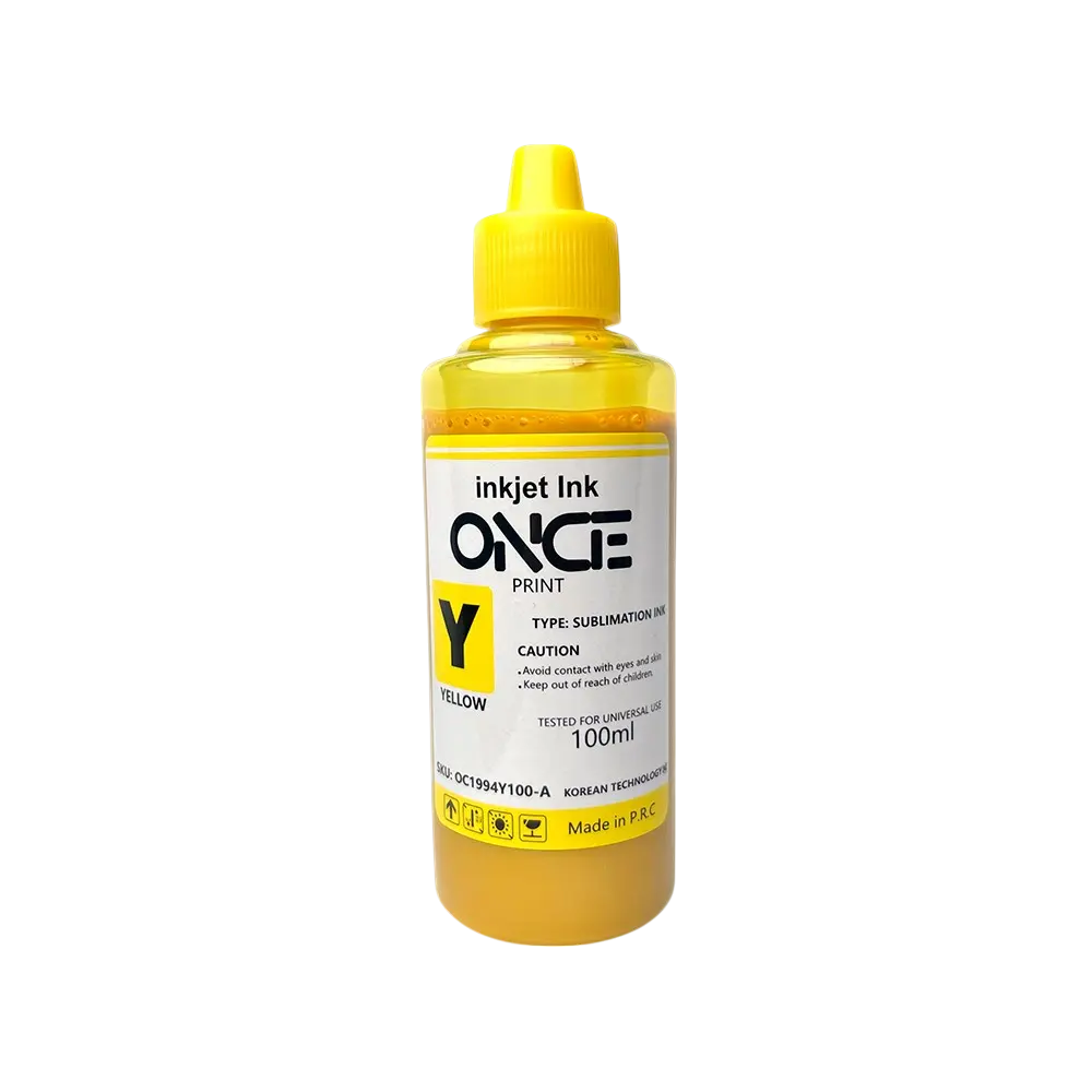 La Tinta de Sublimación Amarilla 100ml con boquilla corta de OncePrint ofrece colores intensos y profundos, perfectos para lograr detalles de alta definición en impresiones de gran calidad.