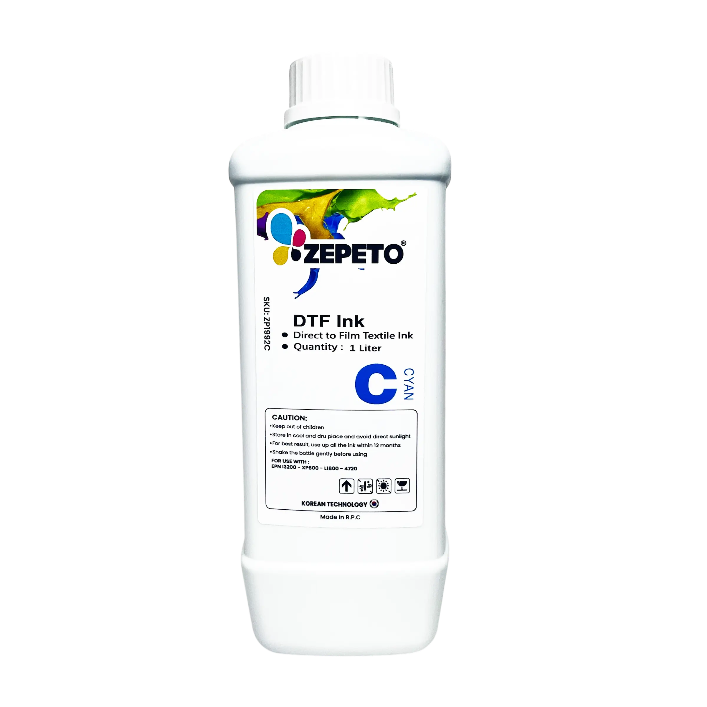 La Tinta DTF Textil Cyan 1LT de Zepeto es clave para estampados sobre telas. Su definición y uniformidad aseguran resultados profesionales con alta cobertura y resistencia.